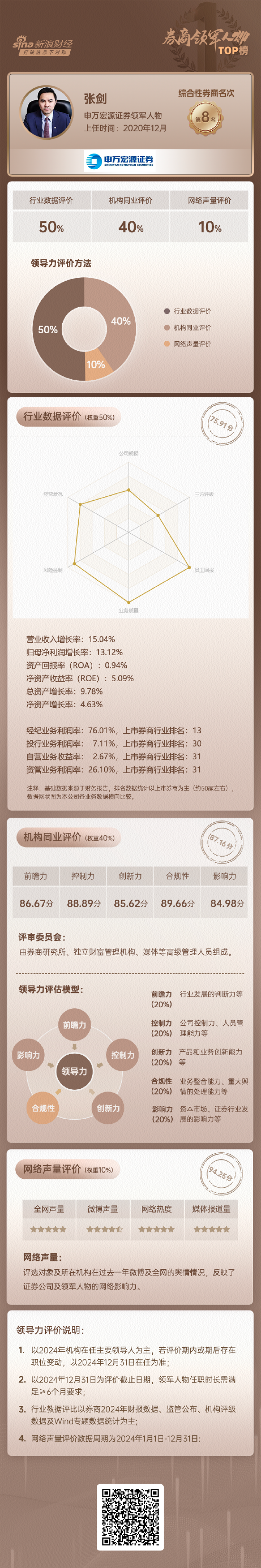 綜合性券商TOP榜:申萬宏源張劍第八 同業評比分數為87.16分